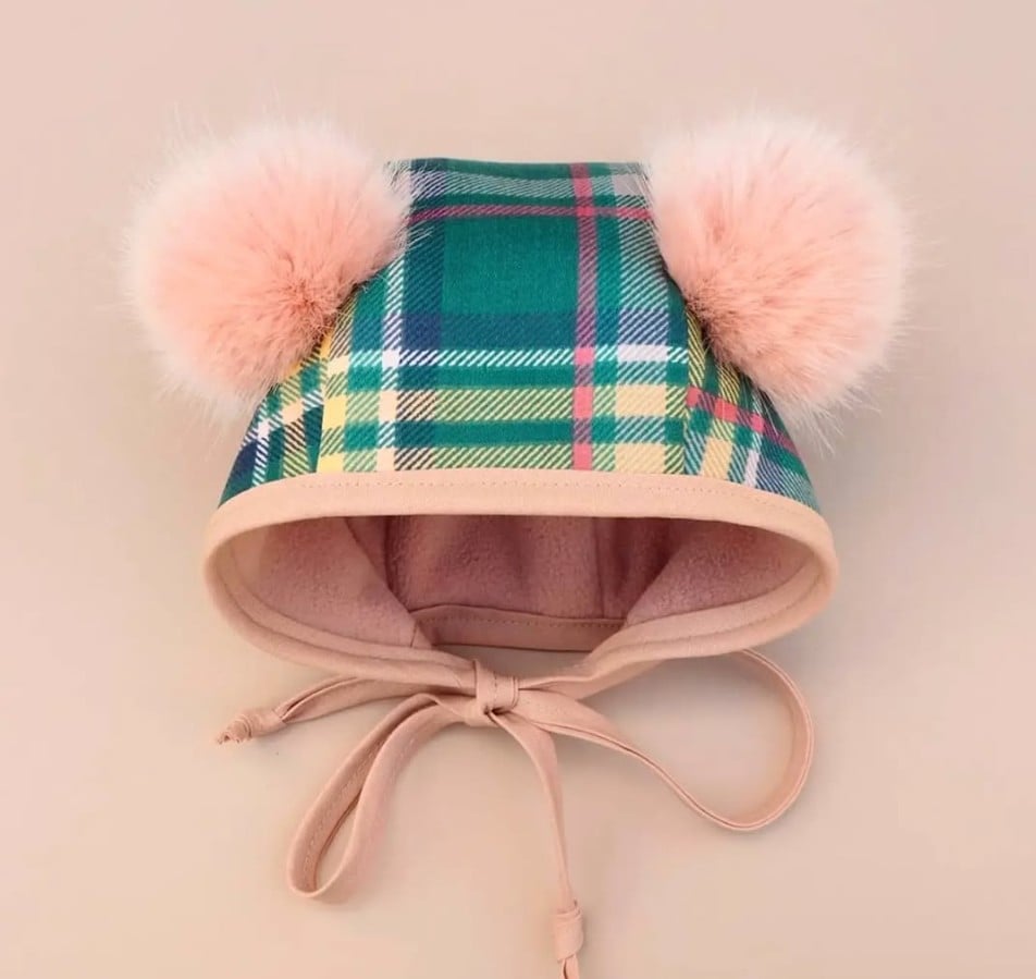 Beautiful green and pink vintage tartan fabric with faux fur super soft teddy pom poms! Lined with warm polar fleece